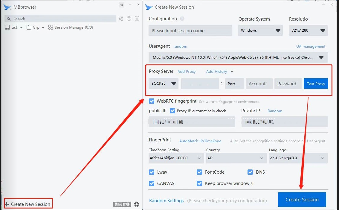 ①Open the MBBROWSER browser,Click 'Create New Session'.