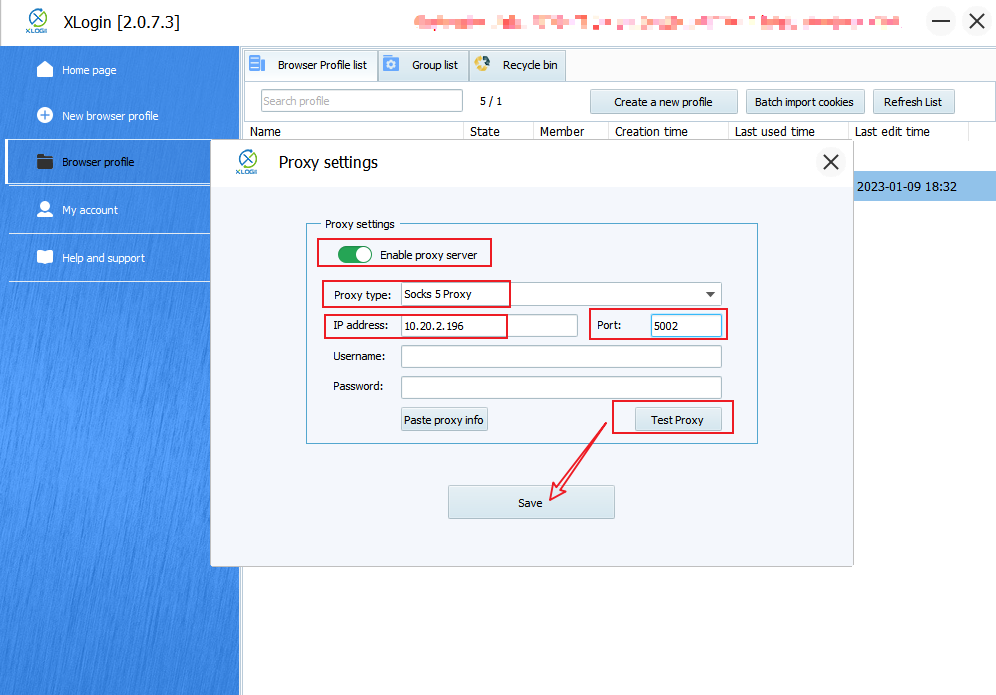 ③Click "Enable proxy Server", select the proxy type (922 S5 proxy supports both HTTP and SOCKS5), paste the Local IP address and port number copied in the 922 S5 Proxy client to the corresponding location, and click "Test Proxy" to check the configuration.
