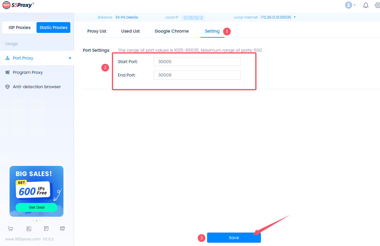 Click "Setting" and fill in the required port range. The maximum number of ports that can be set at a time is 500;