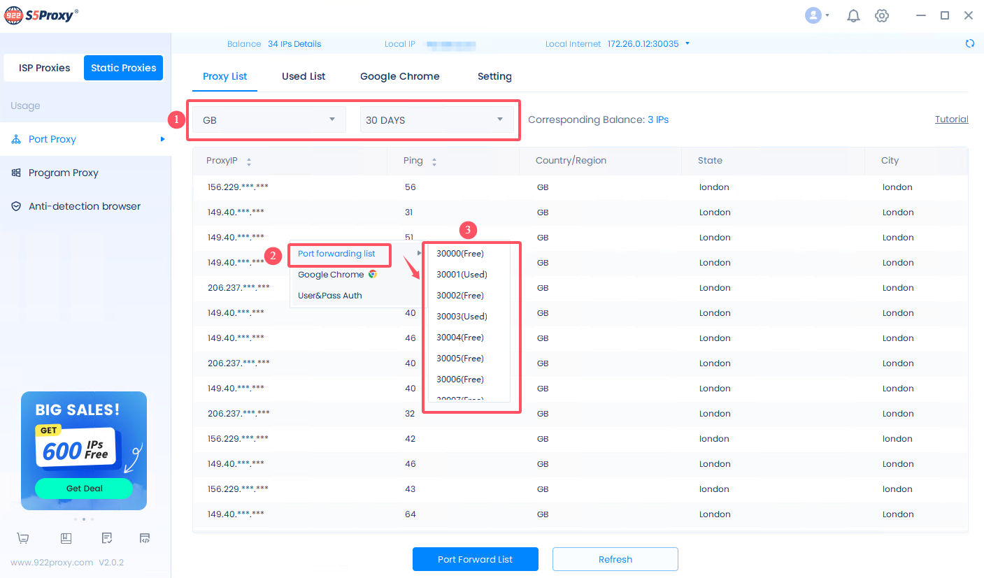 Select the country and validity period according to your needs, then select a proxy in the proxy list, right-click, and select the port that needs to be forwarded to the proxy in the drop-down list. When a green box appears above and prompts "success", it means the extraction is successful.