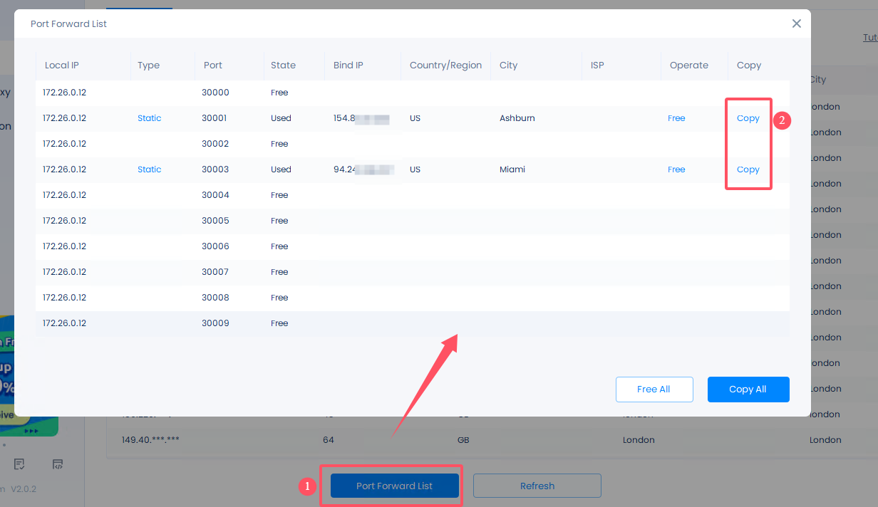 Click the "Port Forward List" button to view detailed proxy parameters. Click the "Copy" button to copy the local IP address and port with one click. To release the port, click the "Free" button.