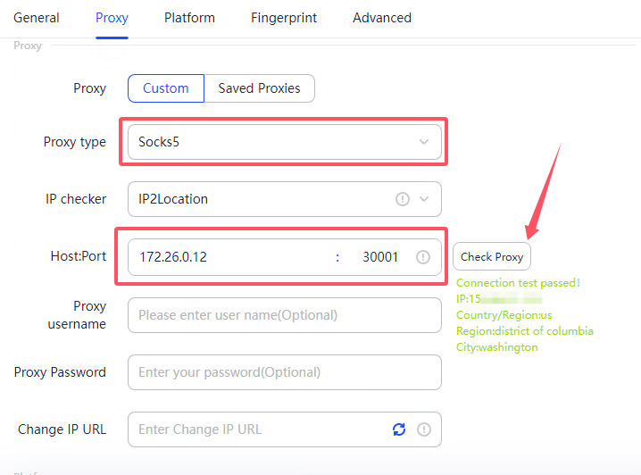 Finally, configure the copied IP and port number into a browser or other software for use. (The picture below takes the Anti detection browser as an example)